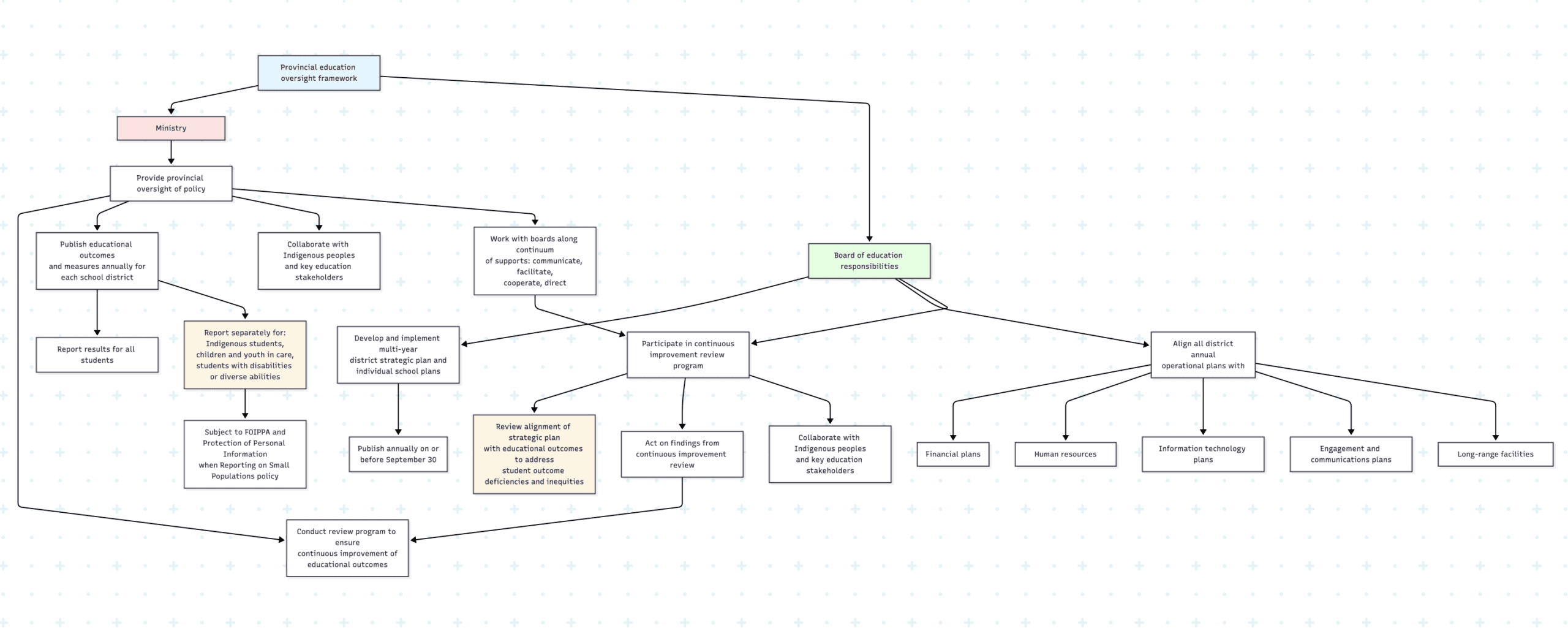 The Framework imposes significant new procedural obligations on school districts: multi-year strategic planning centred on student learning outcomes, annual reporting with data visualisation and analysis, meaningful engagement with Indigenous communities and education partners, review and adaptation cycles, and alignment of all operational plans with strategic priorities. These obligations require staff time, expertise, and coordination—none of which the Framework funds.