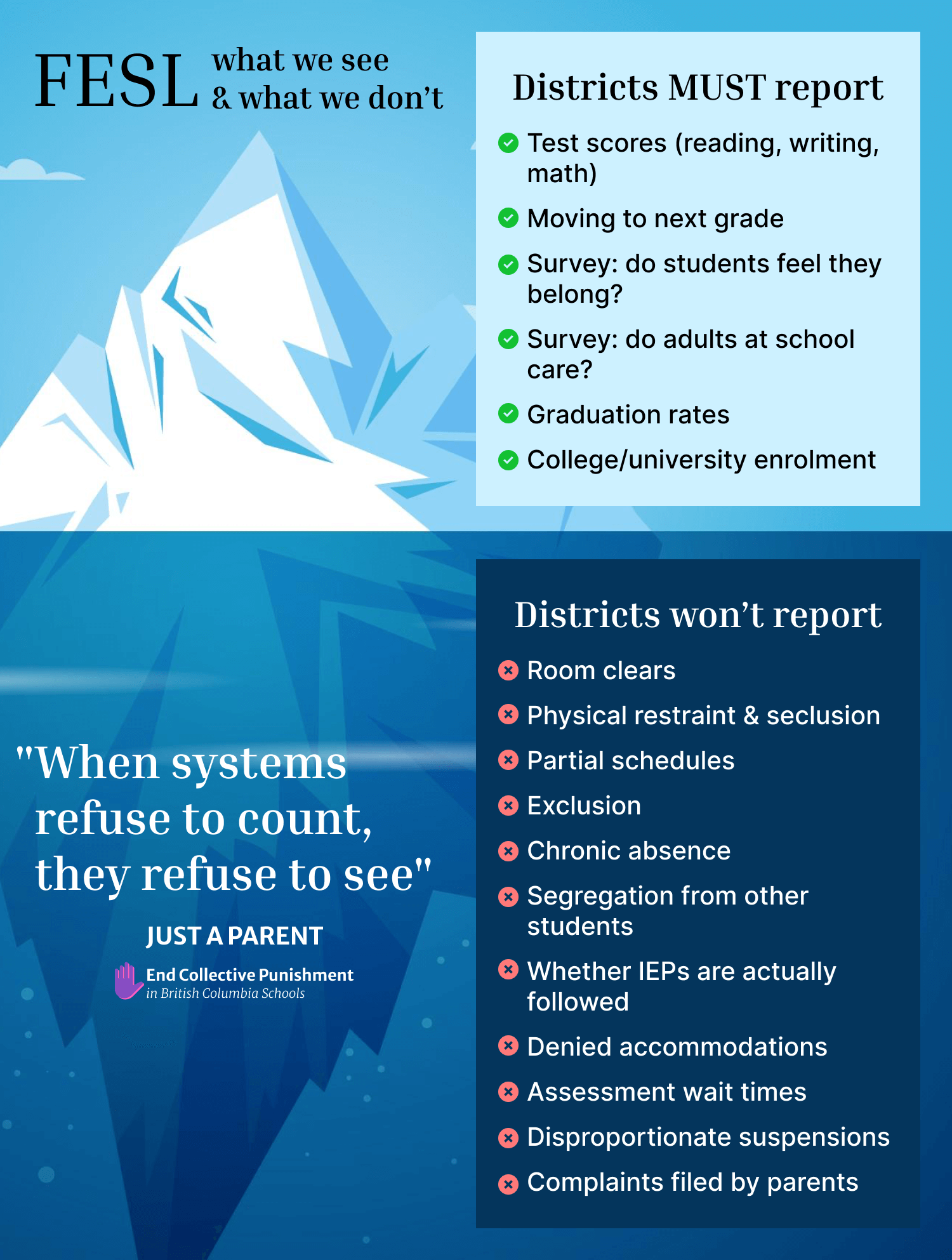 More critically, the Framework provides no guidance on how districts should report on areas where data is masked due to small population sizes. The Q&A document acknowledges this tension (Q10), noting that data sets of fewer than 10 students must be masked according to privacy policy, but that districts “should use unmasked data to have required discussions internally.” What this means in practice: districts can have conversations about subpopulations that are invisible in public reporting, make decisions based on data the public cannot see, and then publish reports that appear comprehensive while obscuring precisely the populations most likely to be experiencing harm—disabled students in small categories, Indigenous students in districts with small Indigenous populations, and children in care in every district.