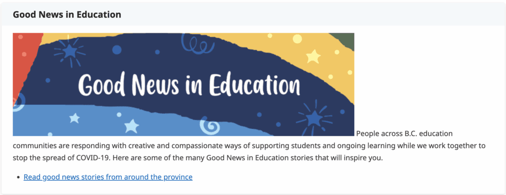 I was browsing through the BC government’s K-12 education page, as one is prone to on a Friday at 7:48 a.m. when frustration with the lack of inclusion in the BC education system bubbles up. On the landing page, a section beckons with “Good News in Education,” and it resolves to a 404 page!!! You can’t make this stuff up!