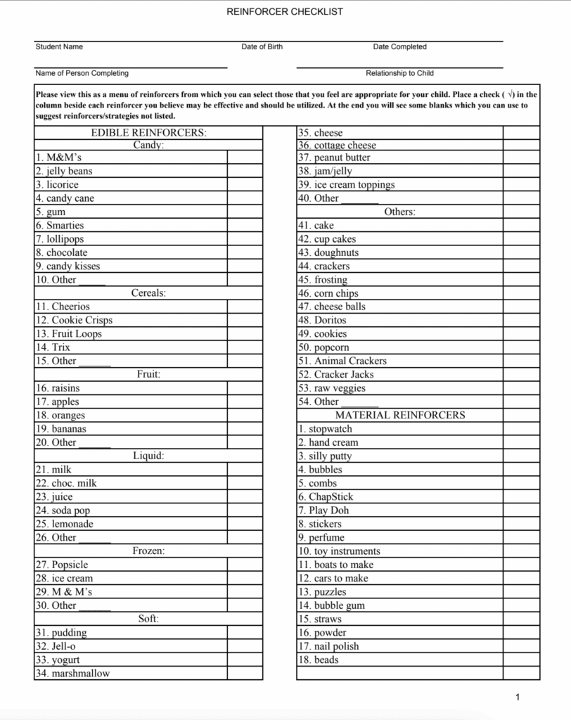 - Reinforcer Checklist & Menu Items