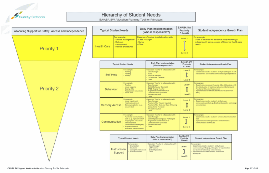 - Current support utilisation: The principal’s request may detail how existing support staff are already fully utilised or why they cannot be reallocated. District decision-makers might review the school’s timetable or support schedule to verify that all other options (reprioritising staff, adjusting groupings, etc.) have been exhausted. They seek to ensure that additional staffing is truly needed and not something that could be solved by different deployment of current resources. Many districts have an internal framework or tool for this; for example, some use an “EA allocation tool” to help principals plan and justify how support hours are used and why more are required sbsurreystor.blob.core.windows.net.