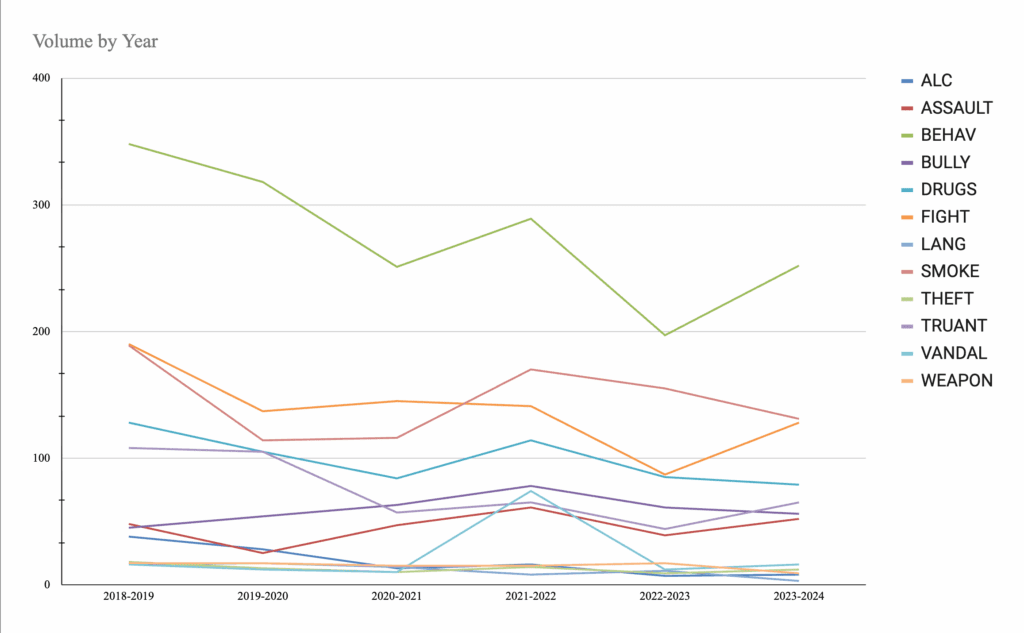 - Weapons, theft, alcohol, language, attendance issues and administrative concern appear as smaller but persistent categories; together they still represent hundreds of suspensions.
